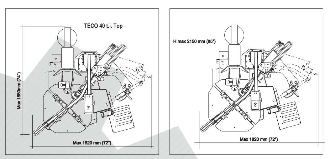 Sistema con capacidad de bloqueo exterior de 11″ a 24″ para TECO 40 TOP y de 11″ a 26″ para TECO 42 TOP (con AR10 accesorio estándar). La especial geometría del sistema de bielas de bloqueo permite mantener constante la fuerza de anclaje independientemente de la dimensión de la llanta y el empalme giratorio en acero refuerza toda la estructura de la máquina - E – SISTEMA AUTOMATICO DE AYUDA TPN:
