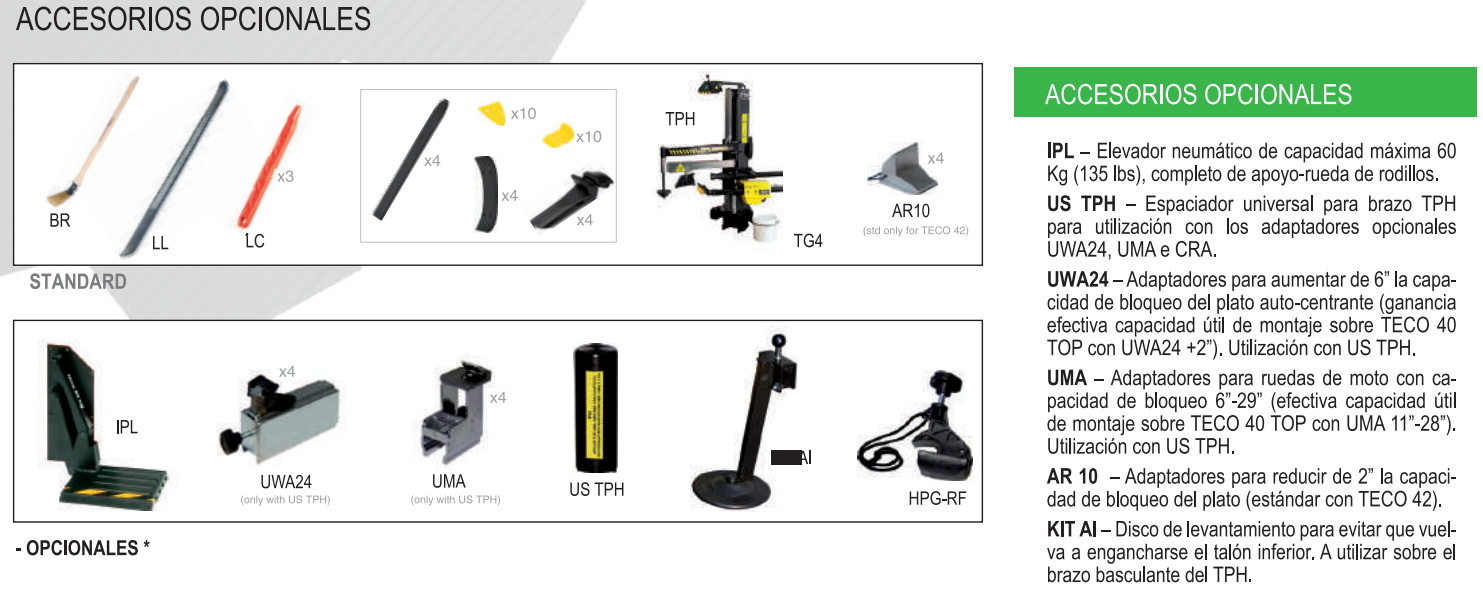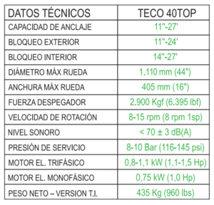 Desmontadoras automáticas «Lever-Less» de diseño único e innovado concebidas para los profesionales del sector e ideales para operar sobre ruedas de turismo, furgonetas y, utilizando un juego de garras opcional, moto: capacidad de bloqueo exterior de 11 a 24″ para la TECO 40 y de 11″ a 26″ para la TECO 42 La nueva gama «Top Line», claramente identificada por la protección cabeza en plástico amarillo, une el tradicional y económicamente conveniente plato auto-centrante con una columna vertical extra-rígida provista de útil automático patentado «Lever-Less». La TECO 40 TOP y la TECO 42 TOP están equipadas de serie con el nuevo brazo automático patentado TPH para operar sobre ruedas de perfil bajo o particularmente dificiles como los «Run-Flat». Estándar en versión 2 speed (solo para modelos trifásicos) y con dispositivo de inflado rápido para neumáticos tubeless en versión ti, los modelos prevén también la configuración con motoinverter (versión MI).