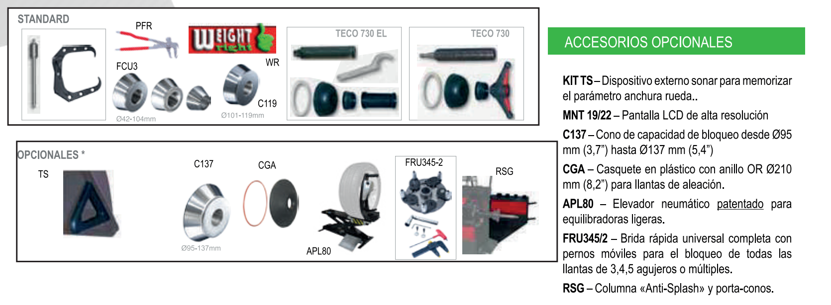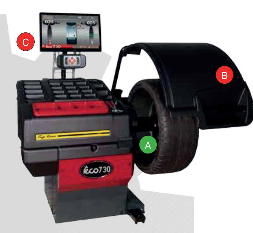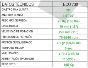 Equilibradora electrónica equipada con pantalla LCD, protección rueda ahorra-espacio y amplia tapa porta-pesos para ruedas de turismo, furgonetas y moto de peso máximo 75 Kg (165 lbs) y máximo diámetro llanta, mesurable con palpador digital interno, de 28″. La TECO 730 prevé: nuevo palpador digital interno para inserción automática de los parámetros distancia y diámetro llanta con selección automática de los programas de balanceo programa de estimación automática del parámetro anchura rueda, búsqueda automática de la posición de equilibrado, iluminador llanta y línea Laser para el posicionamiento de los pesos adhesivos a 6 horas durante el utilizo de los programas ALU. El producto ofrece el siguiente equipamiento software: modalidad de equilibrado estático o dinámico, 7 programas ALU para llantas de aleación de los cuales 2 programas ALU P «Precisión», 3 programas para ruedas moto, programa «Optimización Rápida» y control visual de la excentricidad. La equilibradora está también disponible en versión EL con dispositivo de anclaje rueda automático.