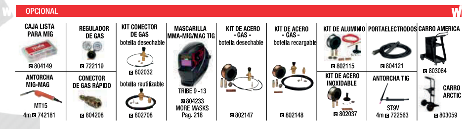 Equipada con soplete MIG-MAG, cable y pinza de masa.