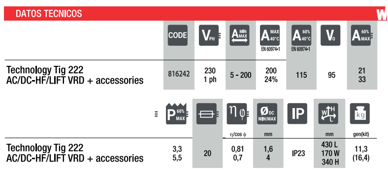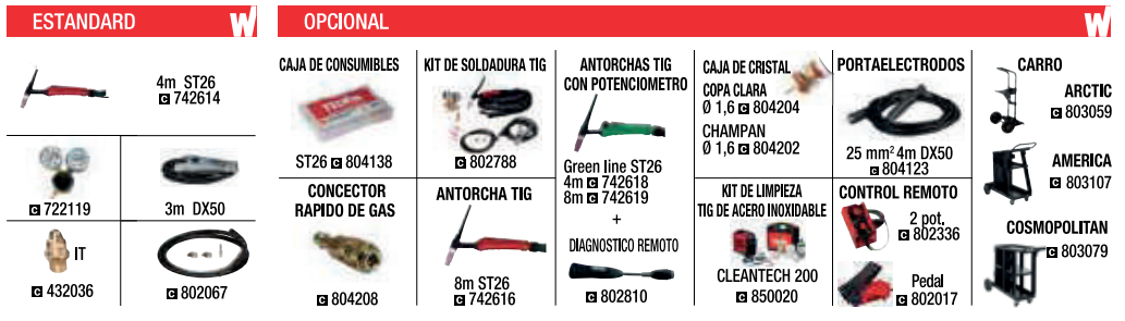 - Regulaciones TIG: bi-level, corriente inicial/final, tiempo de soldadura por puntos, pre/post gas, rampa de subida y descenso corriente, balance, frecuencia de la onda cuadrada.