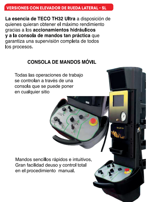 TECO TH32 Ultra es la nueva desmontadora de neumáticos LEVERLESS y CONTACTLESS pensada para los profesionales más exigentes La creciente difusión de las llantas de aleación, cromadas y pintadas, obliga a no estar nunca en contacto con la llanta durante las operaciones de trabajo, ni siquiera con las piezas plastificadas.
