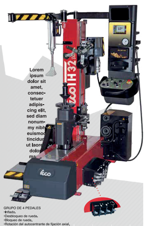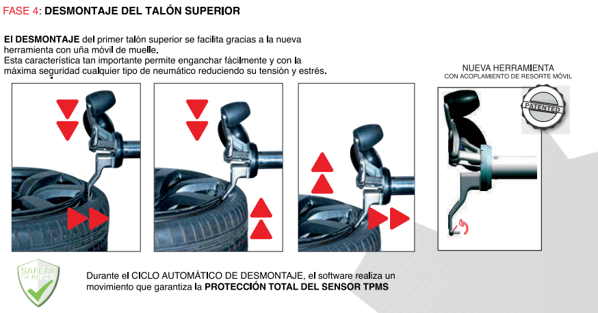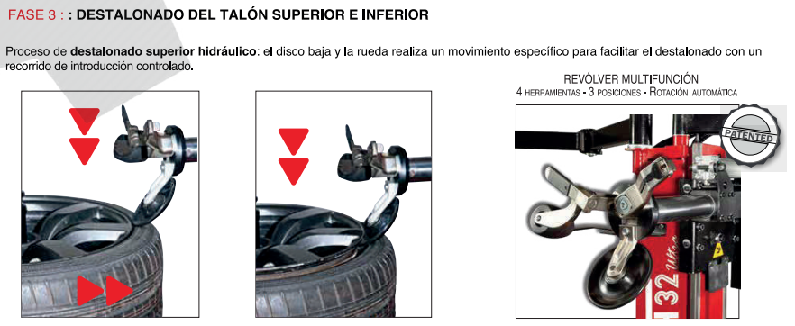 Las principales características que se mencionan a continuación representan los puntos fuertes de esta revolucionaria desmontadora de neumáticos que funciona con cualquier tipo de rueda para vehículos y transporte ligero de 13″ a 32″.