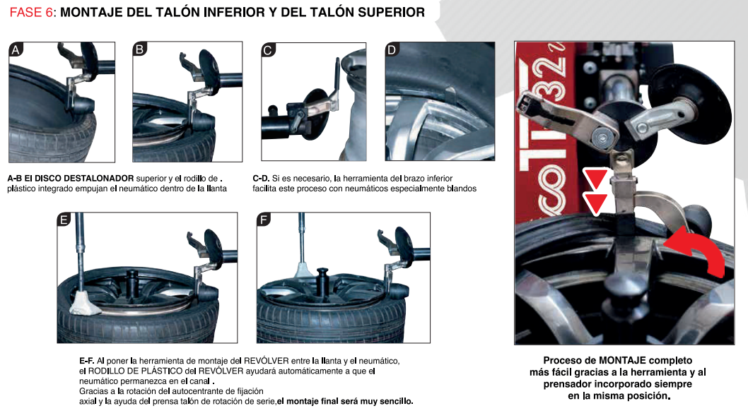 La preselección del diámetro de la llanta, con el consecuente posicionamiento automático de la rueda respecto al REVÓLVER AUTOMÁTICO y el movimiento coordinado entre el eje de la rueda y el REVÓLVER, garantiza una gran facilidad de trabajo y una precisión excelente